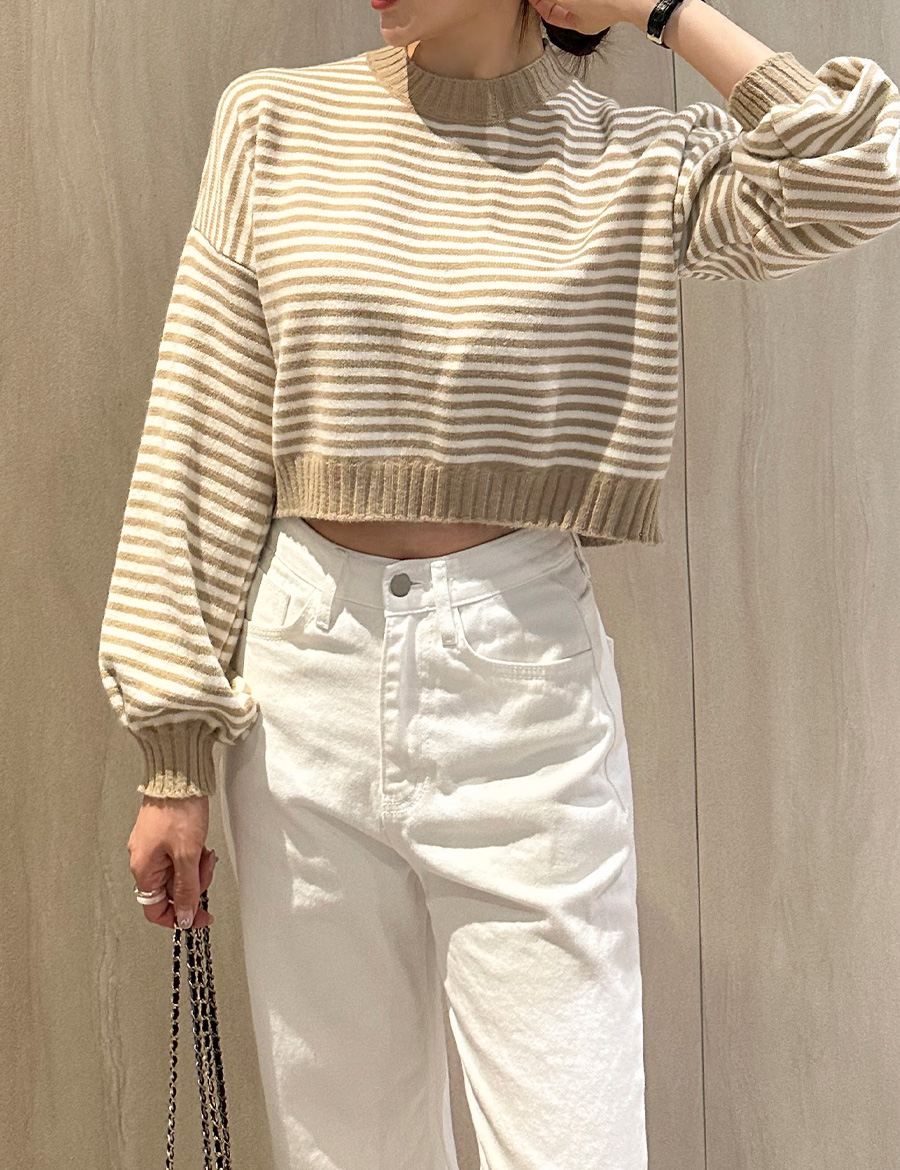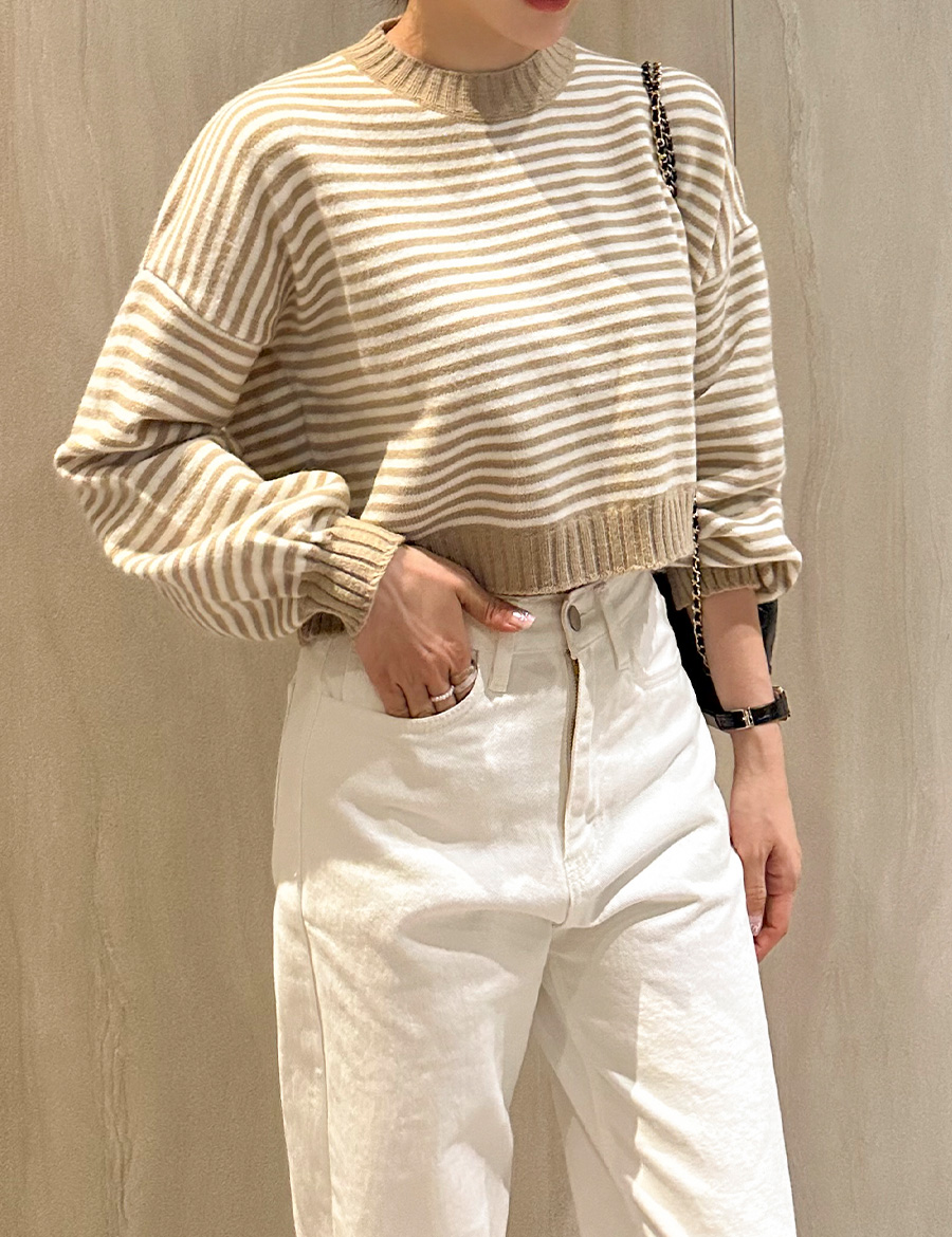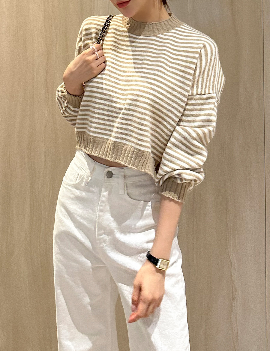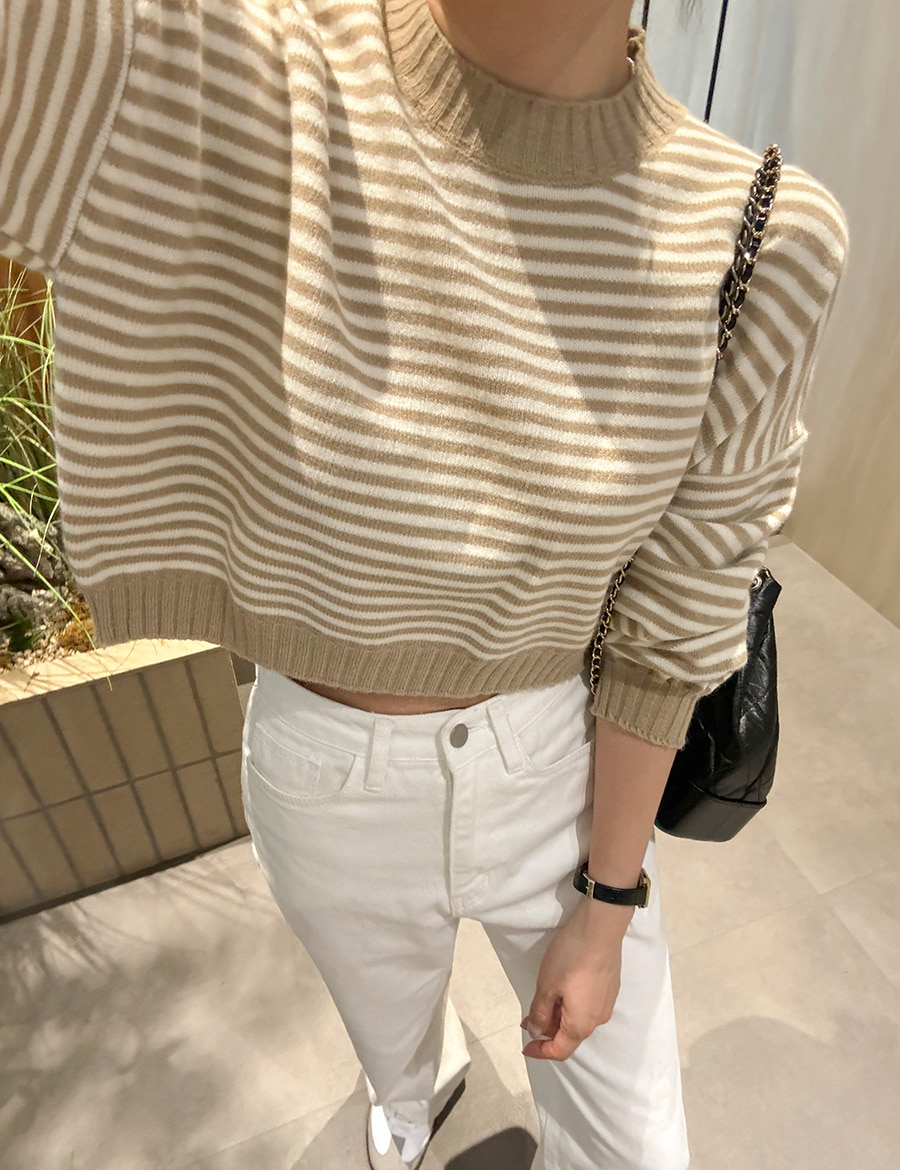 단가라 세미크롭 긴팔 니트 드롭숄더 봄 가을 스트라이프 베이지 핑크 블랙 아크릴