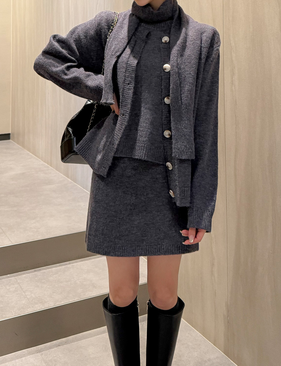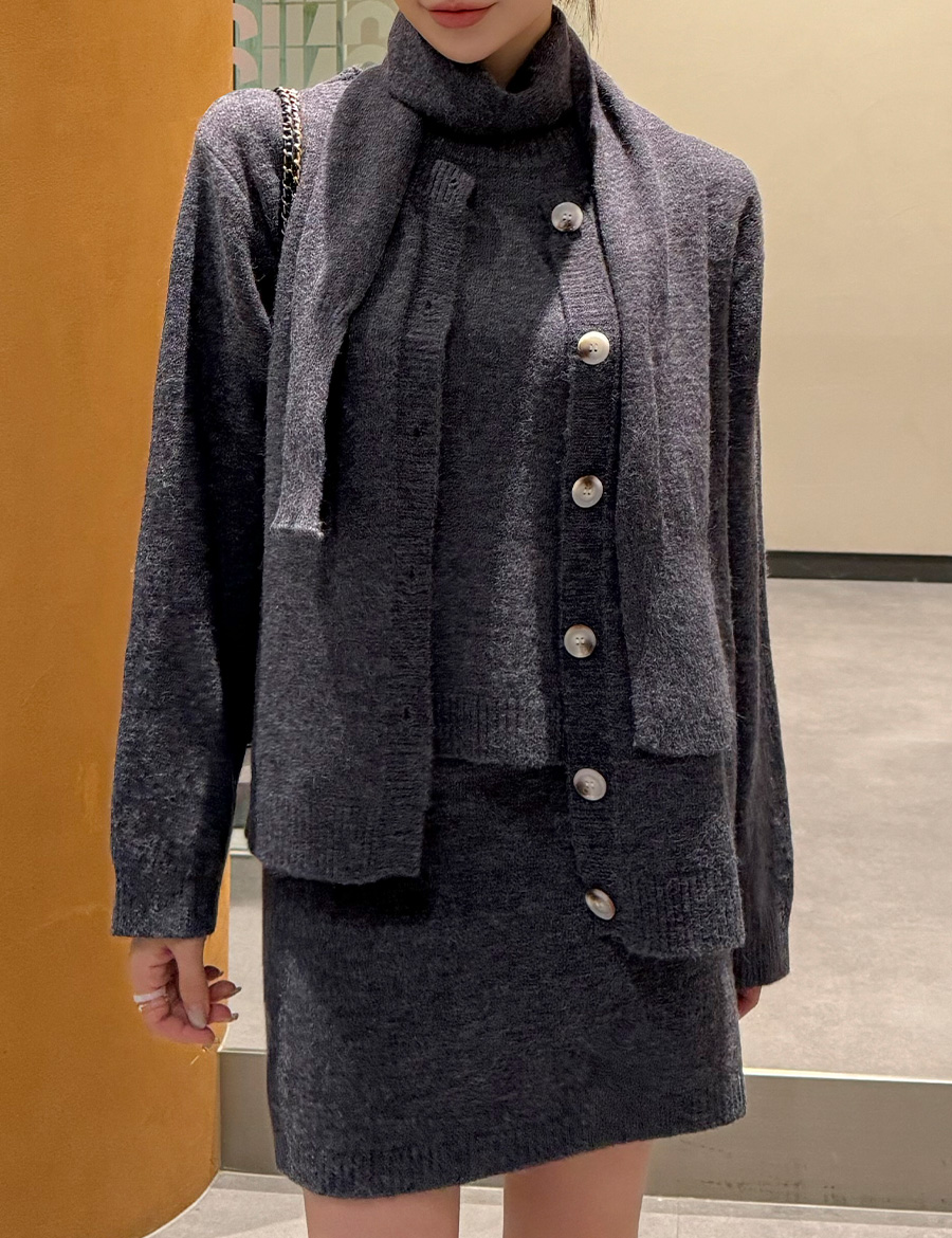 리안 4피스 세트 가디건 반팔 니트 스커트 머플러 차콜 베이지 아크릴 혼합