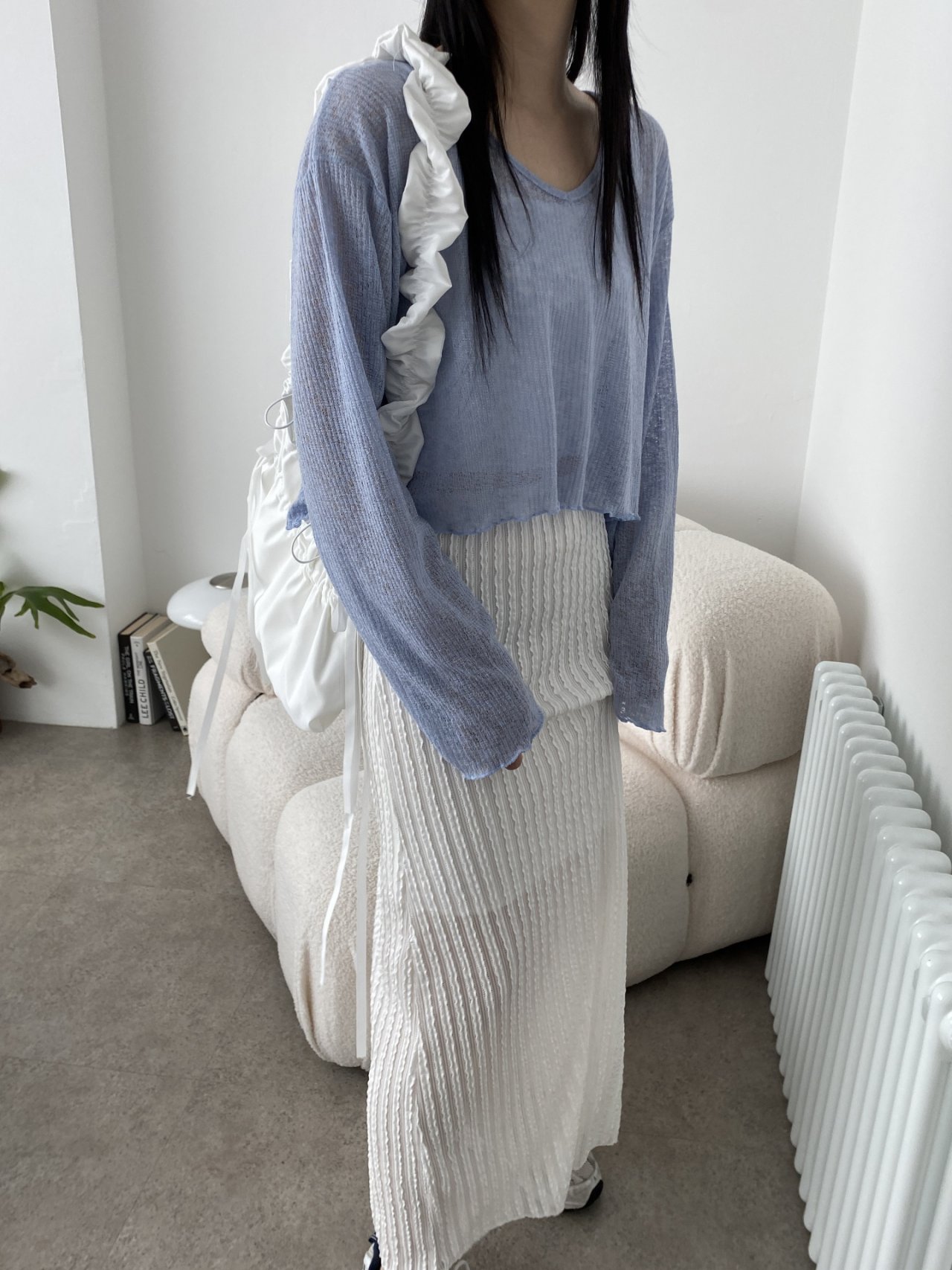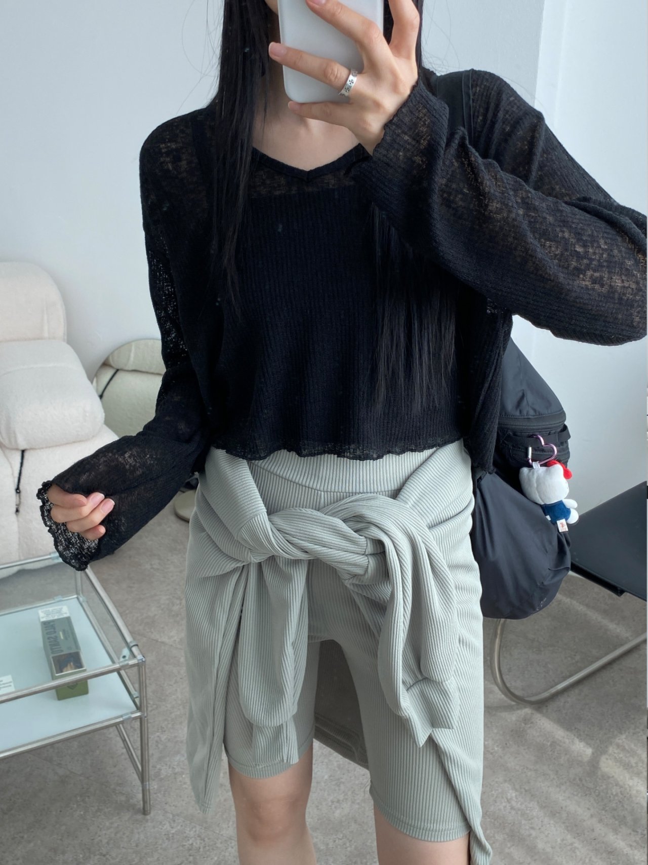 브이넥 시스루 얇은 긴팔 니트 크롭 티셔츠 루즈핏 봄 가을 비치 상의 여름 물결 커버업