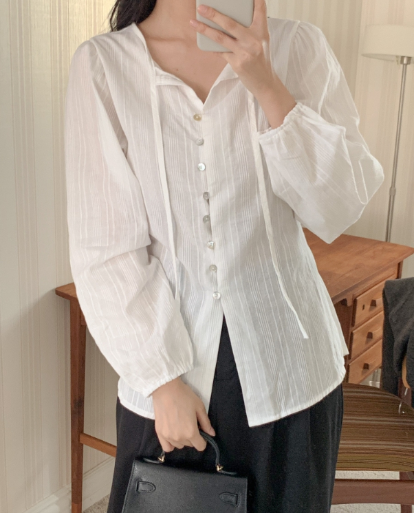 타이 스트랩 긴팔 브이넥 블라우스 셔츠 봄 가을 결혼식 하객룩 데일리